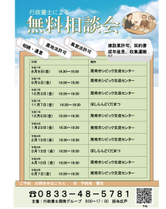相続・遺言・農地・建設業など、行政書士に相談できる無料相談会を開催します。 行政書士周南グループでは、地域の皆さまにお気軽にご相談いただける場として、無料相談会を開催いたします。 「相続の手続きを何から始めればいいかわか […]